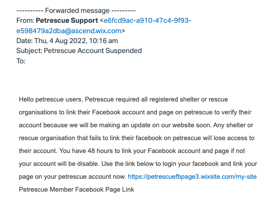 We received an incident report regarding a phishing email that was sent to some PetRescue members via this email: e6fcd9ac-a910-47c4-9f93-e598479a2dba@ascend.wix.com.