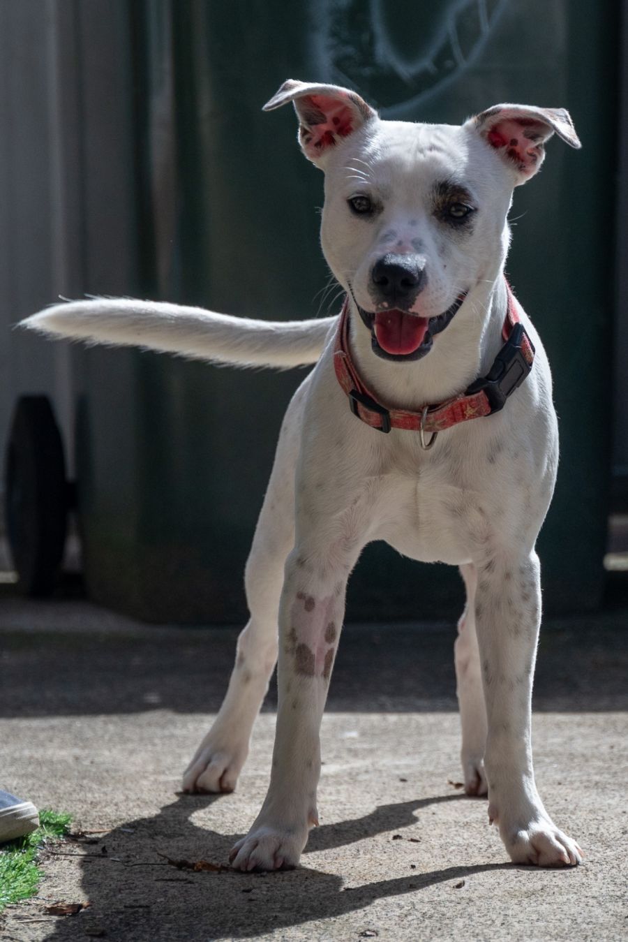 Mr Bean or Little White Bean as he was called in the pound is a 10kg mixed breed . Probably cattle x foxy x staffy . He is high energy , fun and friendly