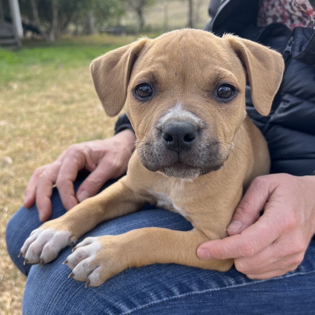 CAPTAIN #2989 - nine weeks old and an American Staffie X. A big friendly boof, he was obviously the one that got most of the food when it was scarce as he was twice the weight of the smallest pup! He will need an experienced owner who can manage a big heavy dog and deal with any possible food aggression as he gets older. The adoption fee for Captain covers desexing, microchip, 2x vaccination, worm/flea treatment and vet check.