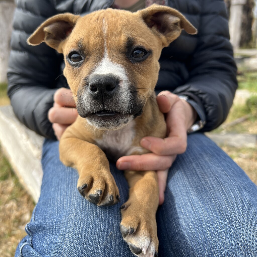 COSMO #2990 - nine weeks old and an American Staffie X. A confident boy, definitely the most vocal of the group, and the first to run up with his tail wagging, in fact his tail is always wagging. The adoption fee for Cosmo covers desexing, microchip, 2x vaccination, worm/flea treatment and vet check.
