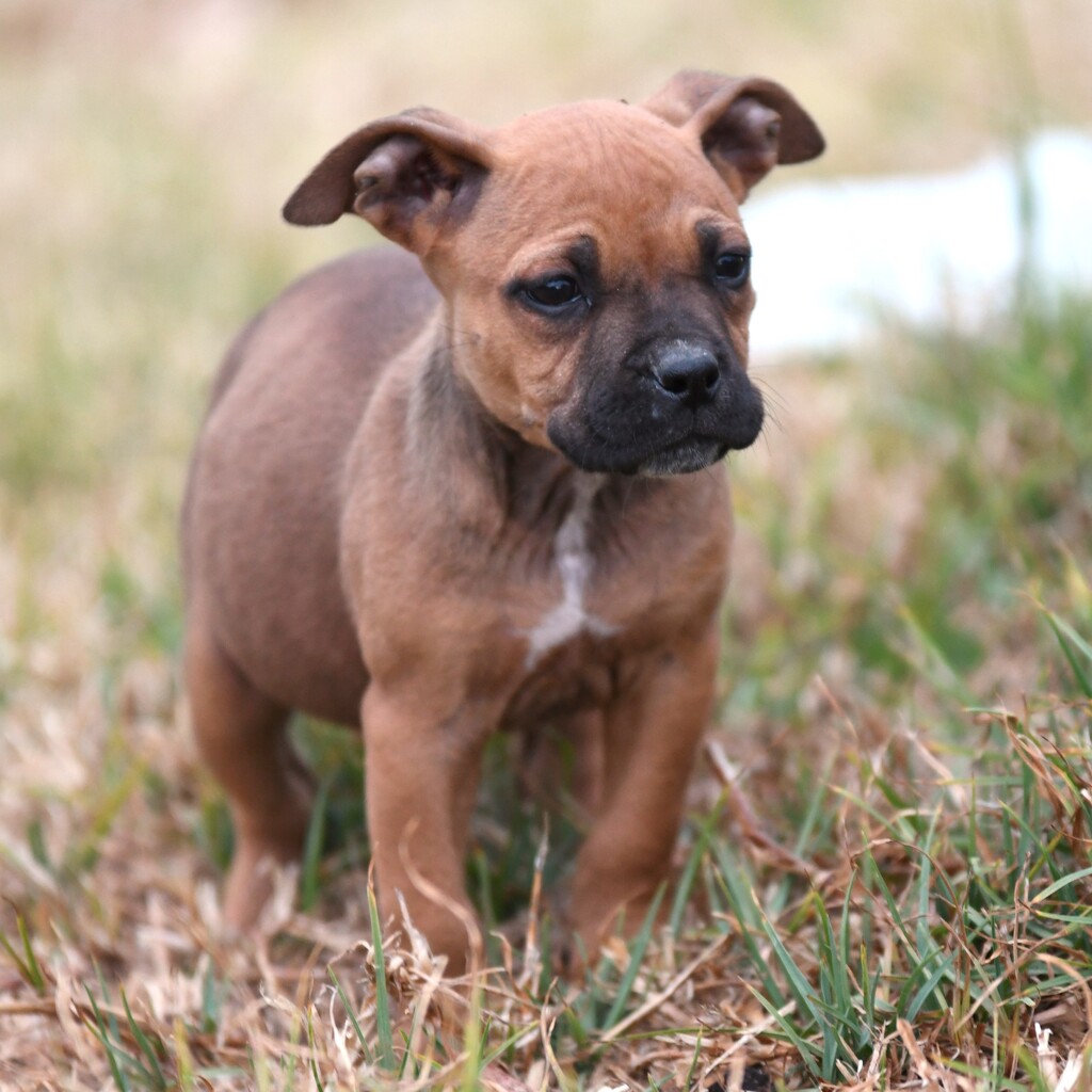 CLARA #2995 - nine weeks old and an American Staffie X. Poor little Clara came in very underweight and half the size of her biggest brother. She has come on really well and is quite a character, not letting her small stature get in the way of bossing the big boys around during play. The adoption fee for Clara covers desexing, microchip, 2x vaccination, worm/flea treatment and vet check.