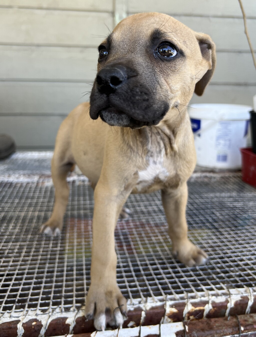 CLAUDE #2992- nine weeks old and an American Staffie X. He is the spitting image of his brother Clyde, he has the very light fawn coat and dark muzzle with only their white markings and his slightly bigger size telling them apart. Another quiet boy who would just love to be someone's special friend. The adoption fee for Claude covers desexing, microchip, 2x vaccination, worm/flea treatment and vet check.