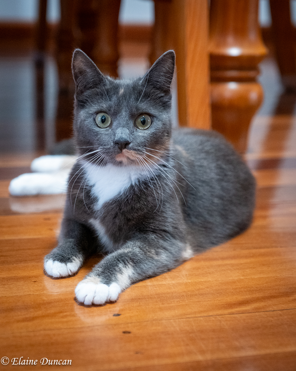 If Miss Fang thinks she's not getting enough attention, she will kindly call out, meowing to her people for some love, and she enjoys following them around the house for company. She will often even come when called, which is quite uncommon with kitties.