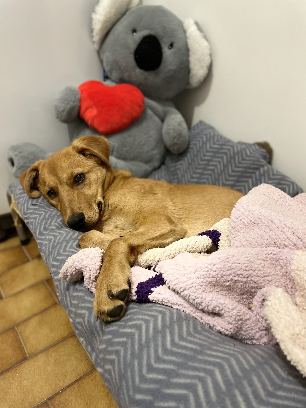 At nighttime, I sleep peacefully in the laundry on my comfy bed all through the night. I'm well-behaved and ready to wake up and start the day with excitement, ready to play with my friends again.