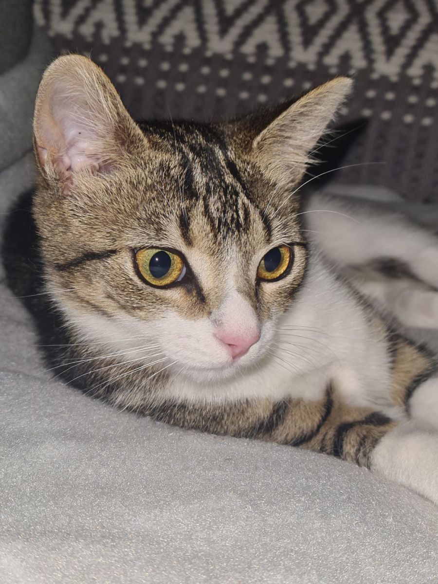 Miss Shiloh is a bit timid but she loves toys, scratching pole’s and laser lights . Good eater and very clean. Gets on well with other cats.