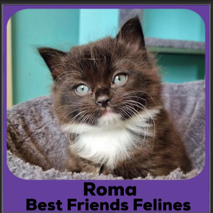 Chunky as well as brave and adventurous. Roma is often the one at the front of the kitten pack exploring, playing and asking for cuddles - or the first to pounce on your feet and roll around claiming them as hers now. She loves a cuddle and a belly tickle, purring and rolling about but can also be easily distracted by a game, toy, or running, pouncing and climbing after her siblings in true kitten fashion. Roma also loves her food, and is always there to dive straight into her meal. And maybe seconds - a growing kitten’s got to eat!