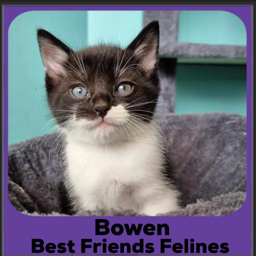 Bowen is a dapper little kitten dressed to impress in his tuxedo markings and the cutest batman mask - it may be a bit lopsided, but he made it all by himself! Bowen came into care with his mama and 5 siblings and was a bit of a mama’s boy at first and a little shy in new places. But he quickly realised it wasn’t scary and was running about playing, wrestling and pouncing in no time. He loves a little tickle on his side, which often has him flopping and purring, rolling about for cuddles. When it’s time for a nap, you’ll often find Bowen in a puddle with his siblings. Bowen loves meal times, but sometimes feels a little crowded at the kids’ ‘table’ with all his siblings when there’s a rush for food. He’ll often let out a battle cry (more like a squeak) before joining the fray at the food plate.