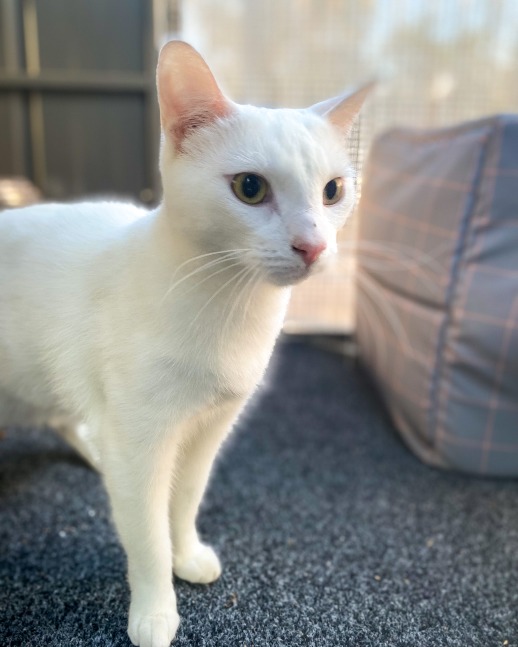 Boo is also looking for an indoor home. Cats with white noses and ears are not suitable for the outdoors as they are very prone to dangerous skin cancers.