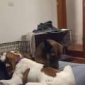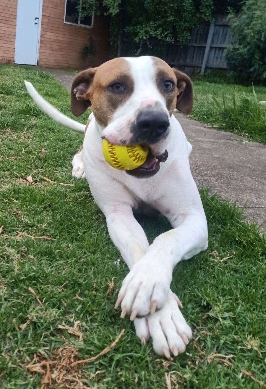 Rubble's heart sings when he's on the couch, revelling in cuddles and belly rubs or carrying his beloved ball around. A gentle giant, he relishes a good bone and is wonderfully well-behaved indoors. His quirks add to his character; he's known to sometimes growl with a ball in his mouth during ball games with doggy friends.