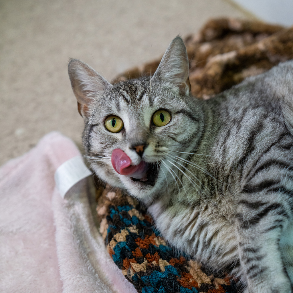 Daisy is a charming young grey tabby cat who will capture your heart with her unique qualities and irresistible charm. Despite the fact that she has no teeth, Daisy is a true gourmet and will enthusiastically eat just about anything you put in front of her. Her appetite knows no bounds, and she'll delight in mealtime as much as any other cat.
