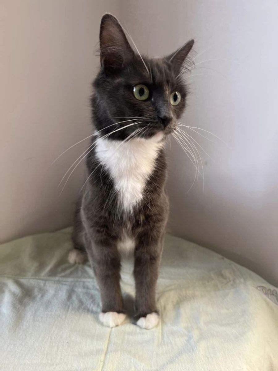 She is very affectionate and inquisitive. She loves cuddles on the couch and is good with other gentle cats