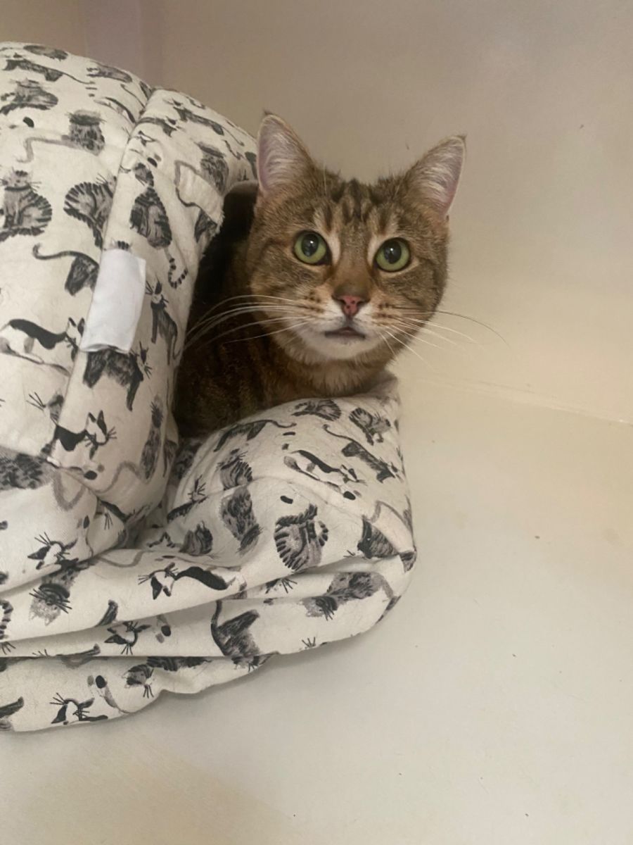 She is a 6 year old loving female cat that enjoys her people. She enjoys affection but also happy just to find a place to rest. She likes to get in or under blankets to sleep.