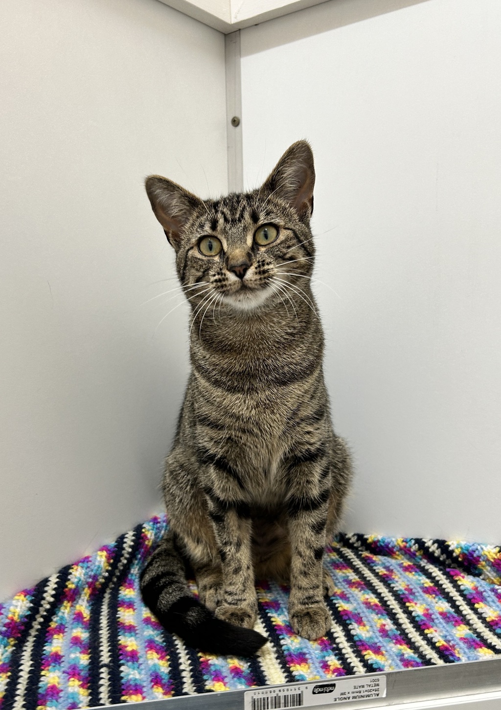Tilly, a cheeky, sassy, and outgoing young cat, is searching for her forever home. Best suited for a household with older children, she charms everyone with soft meows, upside-down rolls, and adorable head tilts. Tilly is a talkative feline ready to share her playful spirit and affection with the world.