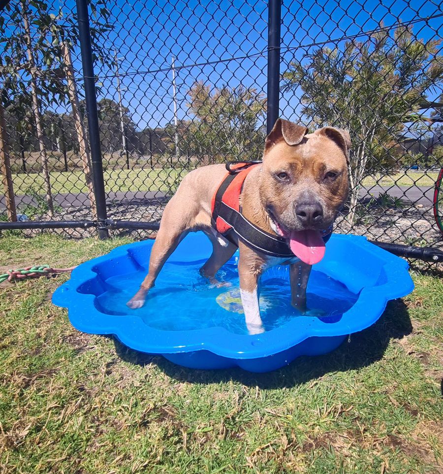 Arnott (imp. 1159) is a chunky, lovable pup that loves nothing more than cuddles and belly rubs. He has good manners in the kennel, never jumping or acting silly around people. When taken out for walks or yard playtime, he may initially pull or jump when excited, but calms down with time. Although not huge on toys, he does enjoy exploring his surroundings and taking some time for himself to relax. He also loves to play in the pool! All in all, Arnott would make an great addition to any home looking for a loving companion. Arnott may also be able to go to a home with another dog but he would benefit from a slow introduction as he hasn't had much socialisation.