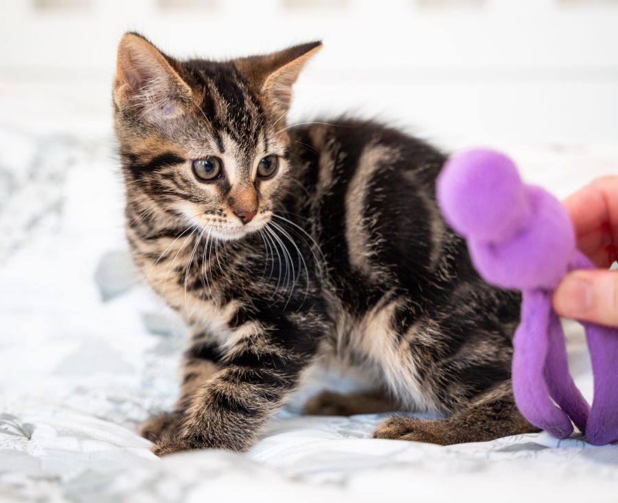 Pebbles is a handsome tabby cat with an exotic and unique marking pattern. He is full of life and very friendly, always eager to explore and make new friends. His curious nature will have him constantly following you around the house, wanting to be close to you at all times. He loves attention from his humans, but also enjoys playing with toys by himself or snuggling up in a cozy blanket for a nap. Pebbles is sure to steal your heart with his charm and loveable personality.
