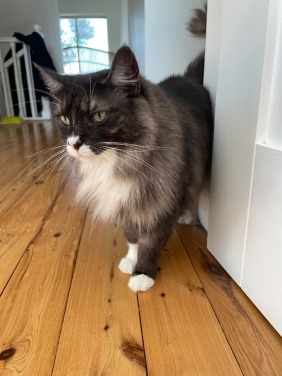 She is a striking 7-year-old domestic longhair, boasting a stunning black and white coat that’s as unique as her personality.