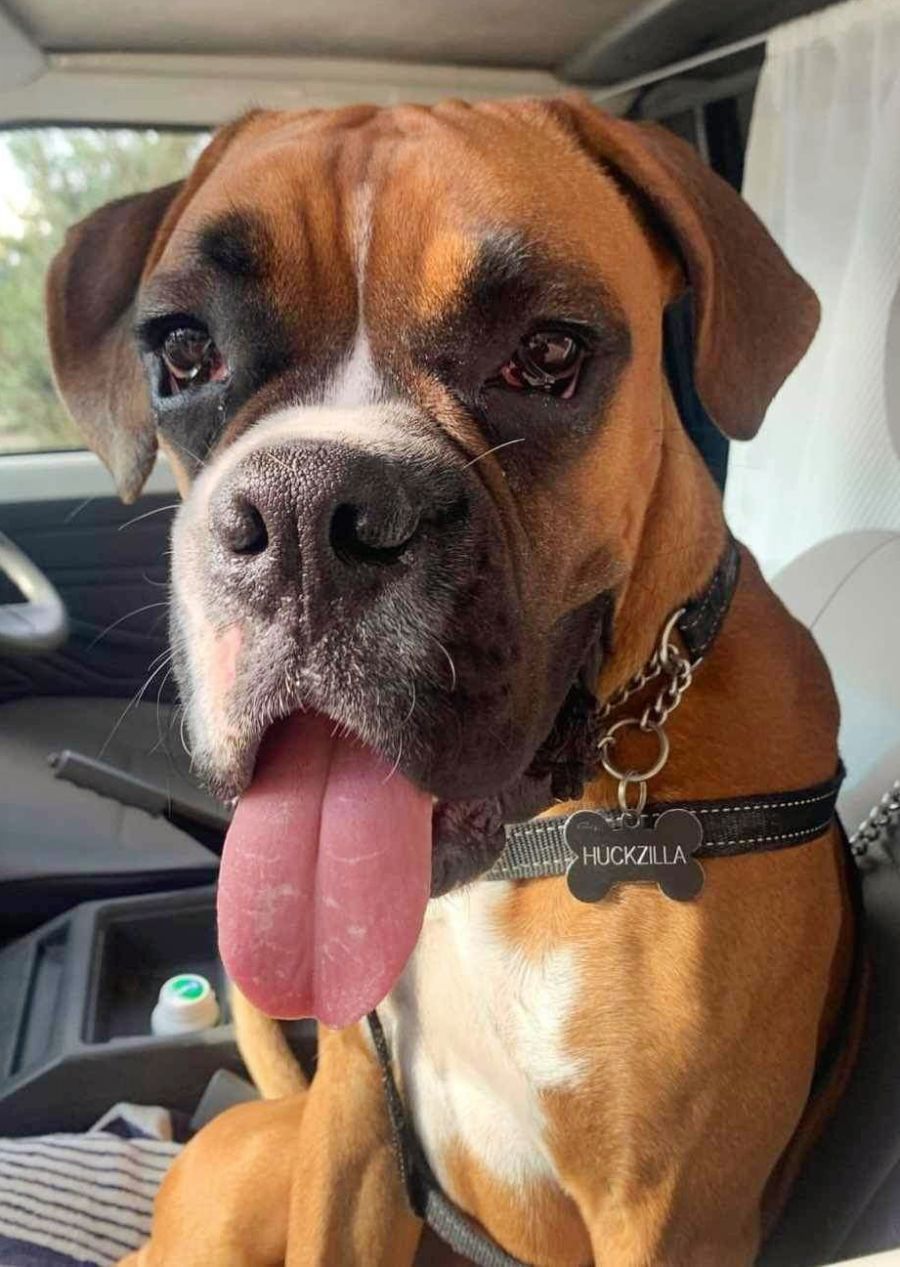 Huckleberry hasn't had much exposure to children, but with his typical boxer exuberance, we'd recommend a home with children aged 10 upwards and are used to big bundles of boxer energy!