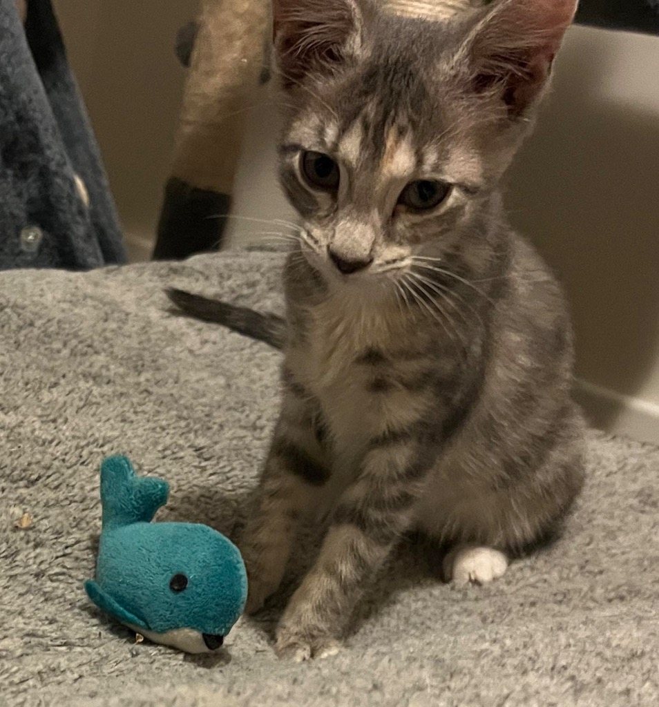 Noodles is tiny, but she is such a brave and confident kitty. When I picked her up she was first out of the crates and started exploring the room. Loves a cuddle but not for too long because there are too many other things to do, particularly zoomies, loves a pat/scratch and purrs all the time.... I have a floor to ceiling cat tower, she climbs it with ease, but is careful with climbing down too. She uses the litter box without issue, and think through more perseverance on her part has eventually made friends with the initially timid Confetti...
