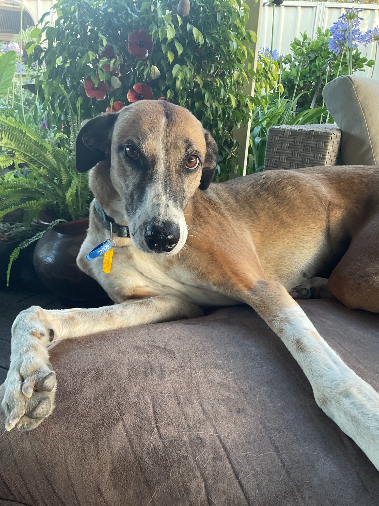 Georgie is a quick learner and has mastered commands like 'wait.' She patiently stands back from doorways, waits in the car to be released, and even waits for her food - she's one smart cookie! Jane has been working on 'stay' and 'come' with her, and Georgie is fantastic in the back yard. She walks well on a lead, and Jane uses a retractable lead for a relaxed walk, allowing her to showcase her graceful movements, much like a greyhound.
