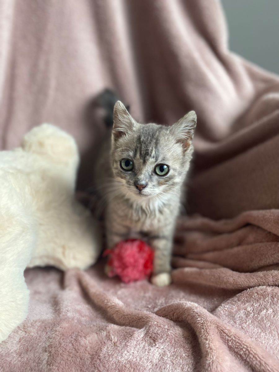 Primrose is a 9 week old Female Silver Smoke Tabby Domestic Short Hair Kitten.