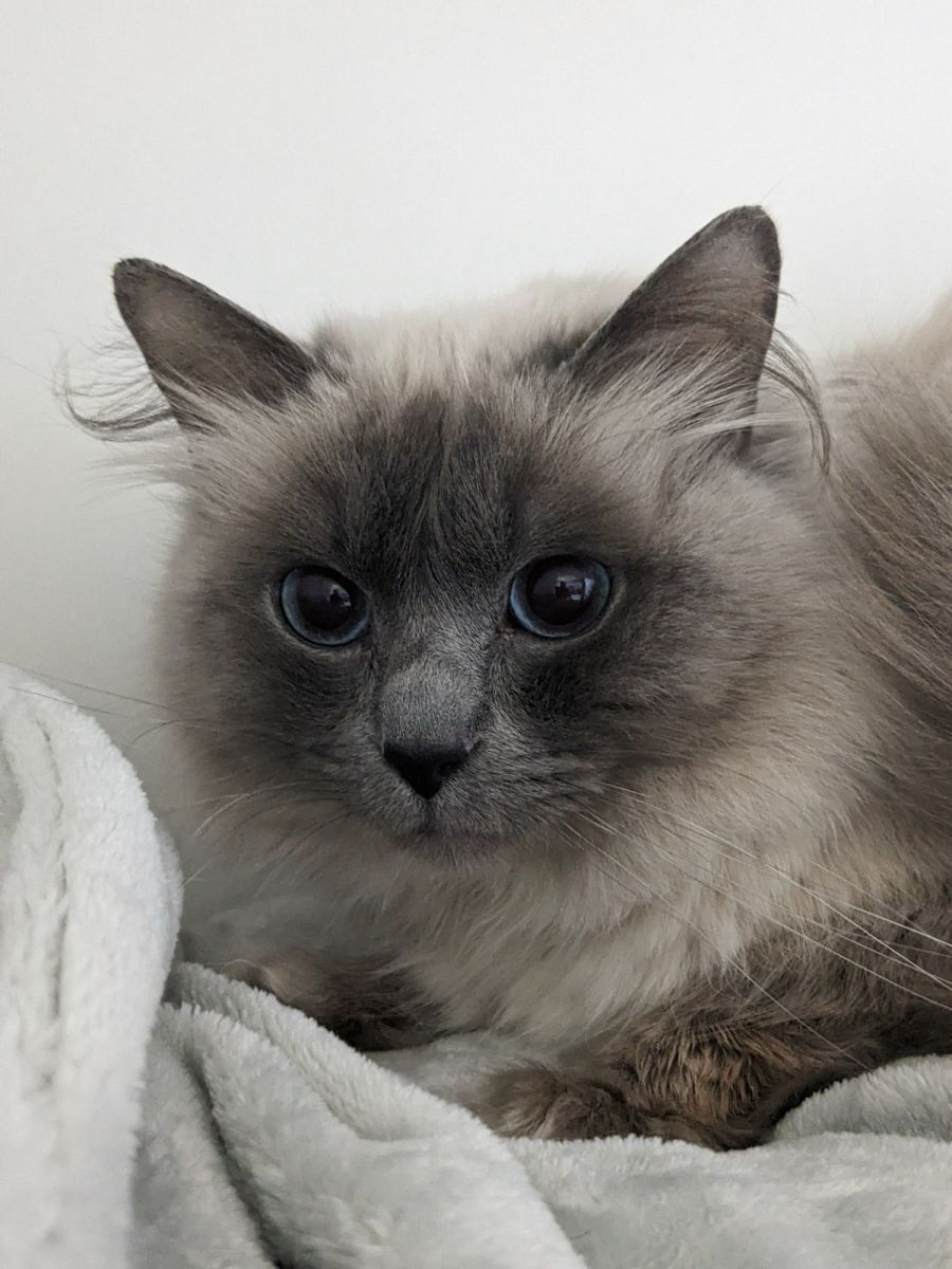 David is the perfect rescue pet. He's a two-year-old Blue Point Ragdoll male who is bonded with his housemate Posh. His stunning coat requires moderate maintenance, but recently he had a groom to take care of some matting that had developed. He is playful with Posh and loves to snuggle up together for cuddles and naps.