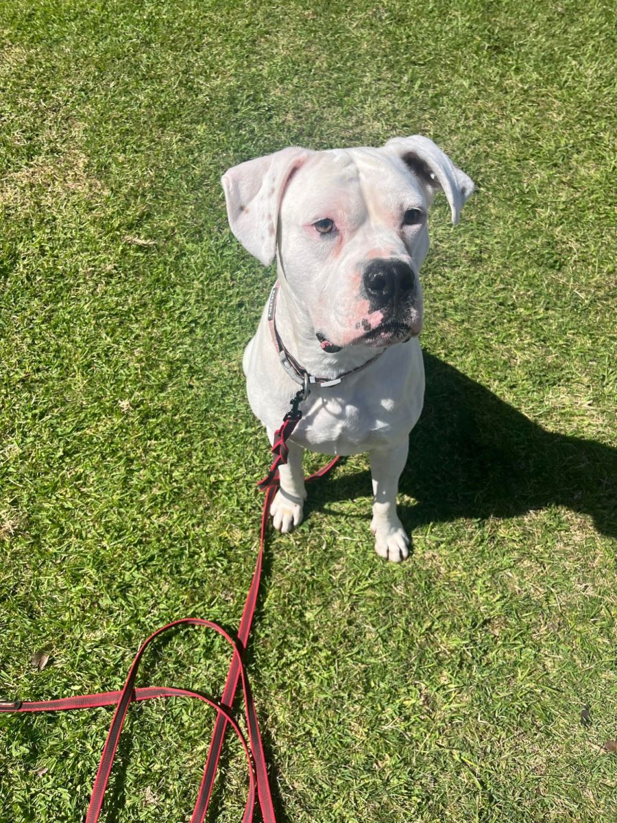 Meet Soldier, a 4-year-old American Bulldog who may have a hearing impairment but is suspected to hear some things. He's been in our care for 4weeks and has already mastered basic commands like sit, stay, and come.