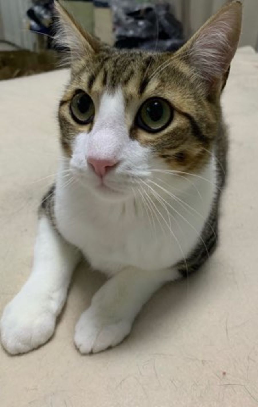 Mino would be suitable to a quiet home and ideally be adopted with another gentle young kitten to play with.