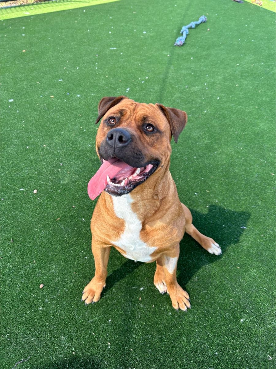 Hazel is a sweet, timid lady who loves her toys! She can be strong on the lead at times but calms down quickly after burning off some energy. She would benefit from some basic training, which is made easier by her motivation for treats. Hazel loves to soak up all the attention to herself, so she would need to go to a home with no other dogs until she gets more socialisation. Hazel would best suit understanding, patient owners with no young children and no other pets, who are prepared to provide basic training and give lots of love.