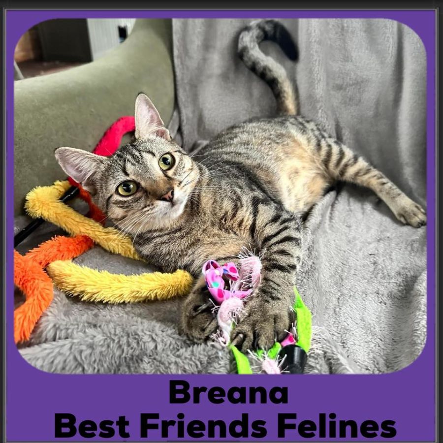 Breana will check in with her human before heading out to find adventure but loves nothing more when she is done than cuddling up on your lap. She has the loudest purrs and all you have to do is touch her or talk to her and the purr starts.