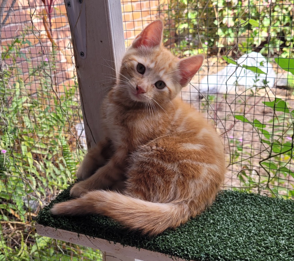 I'm very playful and love batting a ball around my cat tower. Wave a string and toy in front of me and I'm all in! I love roaming the house and aren't scared of the house's dog. I love pats and will happily roll over and enjoy your attention. I've been known to flake out on the table, a little indignant if asked to move. I'm a sweet kitty.-