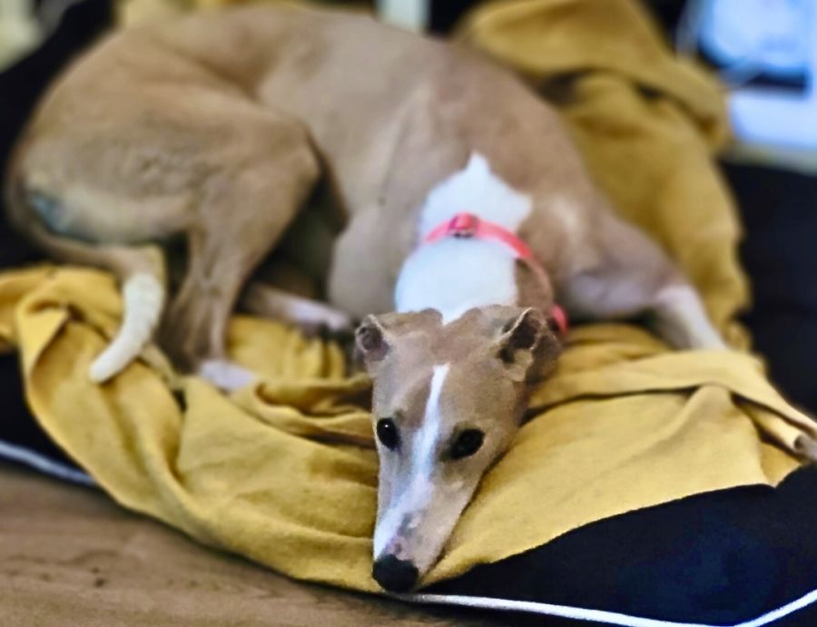 I sleep on my bed in my foster mum's bedroom. I'm an early riser and I enjoy stirring up the other greyhounds who would prefer to sleep in (because they're older than me). I like going out for walks. I walk really well on a lead. My preference is two smaller walks a day, just to keep me occupied and happy.