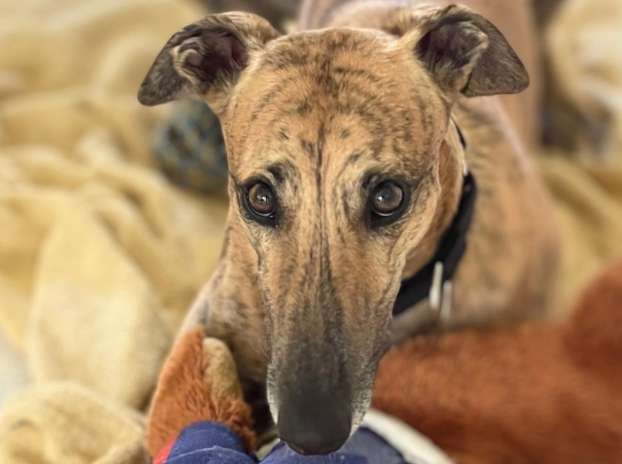 Since coming into foster care, where she has a big greyhound brother, Honey has adapted very well to the wonders of home life. She sleeps well at night in the same room as her brother. During the day she has a choice of several inside or outside beds, and she enjoys using them both. She loves zooming in the garden and also sun baking if not too hot. Like most greys she also loves long sleeps throughout the day.