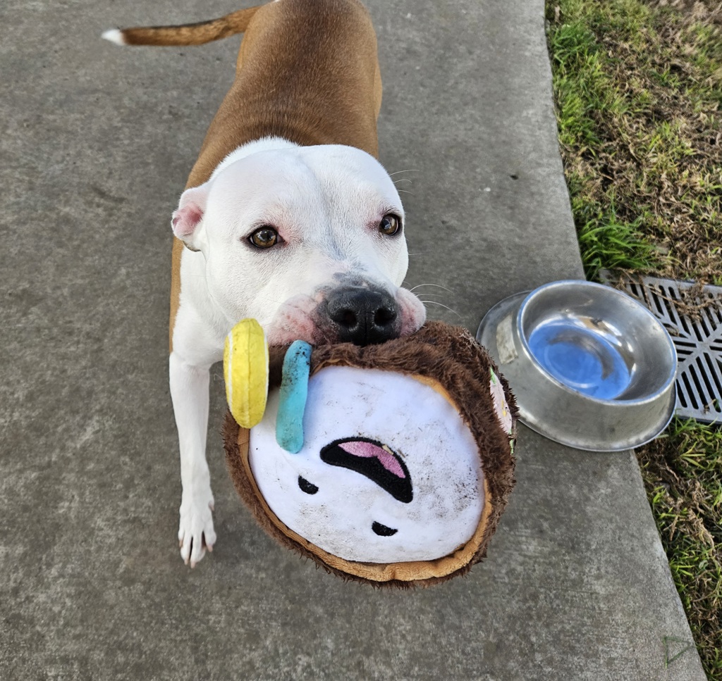 This sweety absolutely has melted all our hearts and loves to be around people. She would love to be included in her family activities and spend her time following you around. She has shown a goofy playful side with other likeminded social doggies but can be very boisterous and ill mannered - She loves to jump all over them and be in there face.