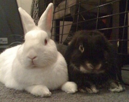 Monkey is a white dwarf x and panda is an black otter lop. Monkey is very funny and loves to binky (happy hops) around the room. Panda is a little reserved. Both bunnies like a pat. They were surrendered when their owners had their 1st child and felt that they could no longer give the care and attention needed to the bunnies. The bunnies must be housed inside as part of the family