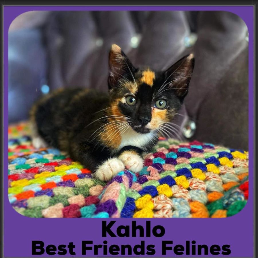 Kahlo has a radiant little personality and makes fast friends with everyone she meets. She enjoys the company of her siblings and loves playing with them. She also enjoys the company of the older cats she currently lives with. She is very respectful of personal space and has excellent manners around other animals. She would do well with other animals or on her own so long as she has lots of human company and lots of toys. Kahlo is a happy little love bug that would thrive in any household.