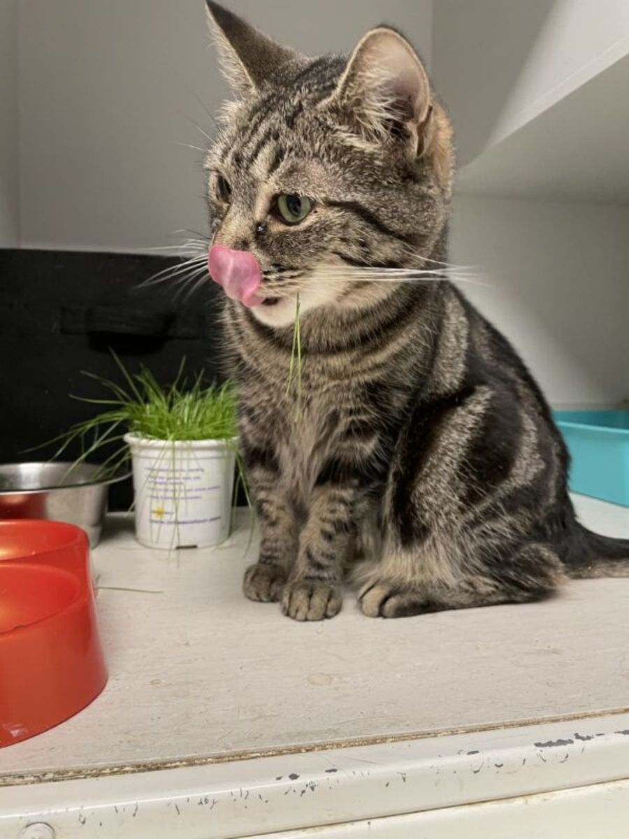 Tosca, a sweet and affectionate female brown tabby, with pretty green eyes. She is a little more timid than her sister Kittah, and has a “security box” that she loves to sleep in.