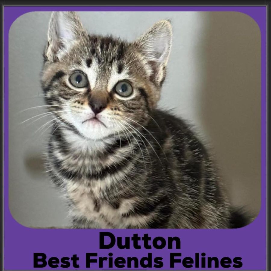 Dutton is a playful little man who likes to play hard with his brothers and foster siblings. He is so funny to watch with his antics, he amuses himself for ages and amuses us all. He snuggles up with the other kittens in the smallest of spaces. He loves to climb up the cat tree and chase the others up and down the hallway. Dutton gets along with his foster siblings the cats and the kittens and even his dog foster brother. He likes to snuggle on your lap or if a lap isn’t readily available he snuggles in one of the cat beds even, actually especially if there is a kitten already in it.