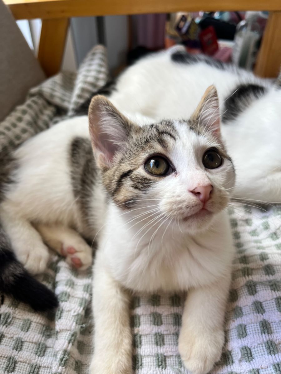 Murphy is an energetic, affectionate, and sweet 12 week old kitten looking for his forever home. He has a predominantly white coat with tabby markings on his face, head, back and tail. Murphy loves nothing more than spending time with his mum and getting back scratches and treats. He's not a fan of loud noises, bedtime or waiting for dinner time though!