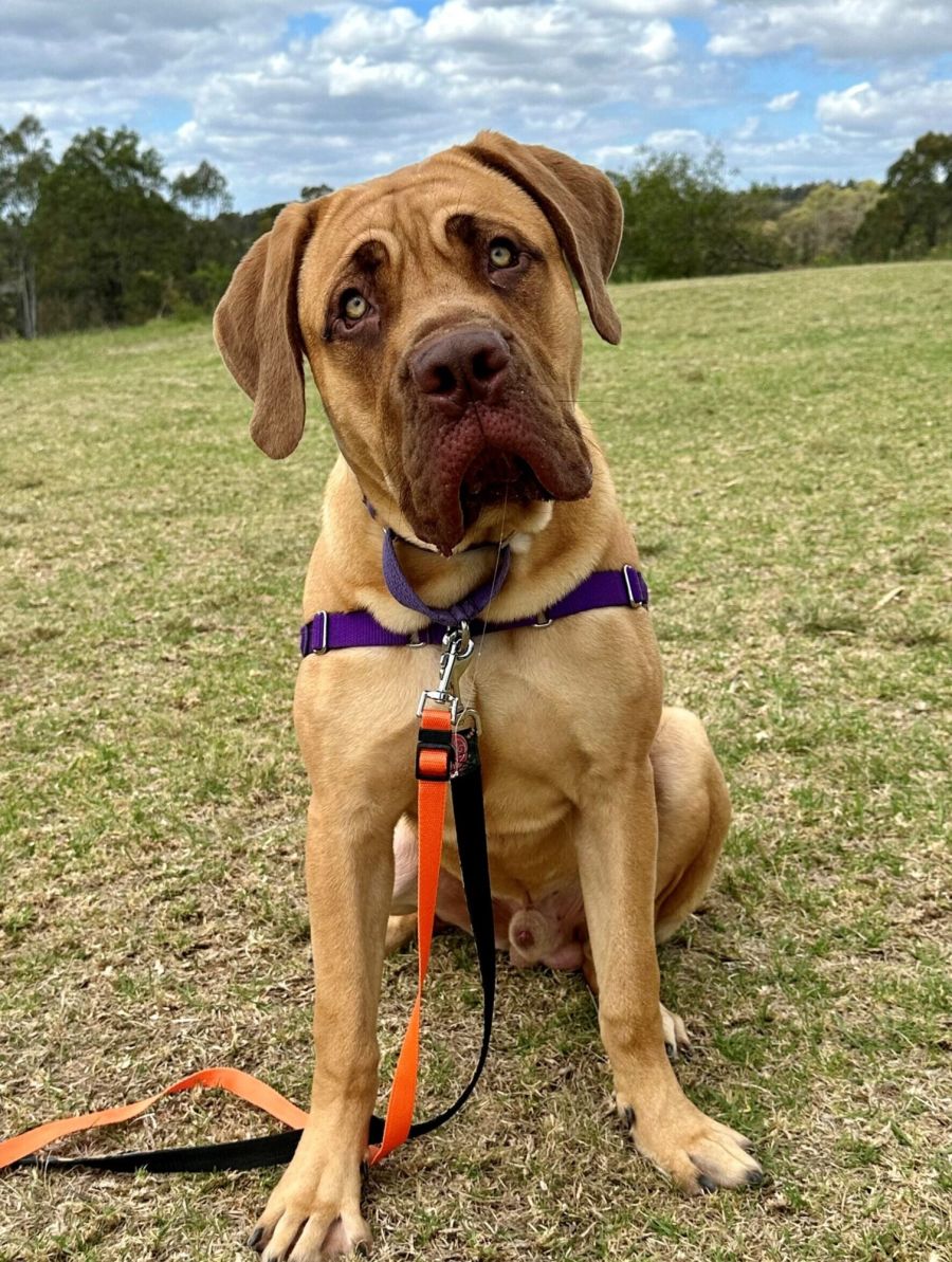 Meet Max – a 7.5-month-old Cane Corso X Mastiff weighing over 45kg! Max is a strikingly handsome goofball with a sleek coat and soulful green eyes that mirror his friendly nature. His large frame and goofy grin make him quite the head-turner.
