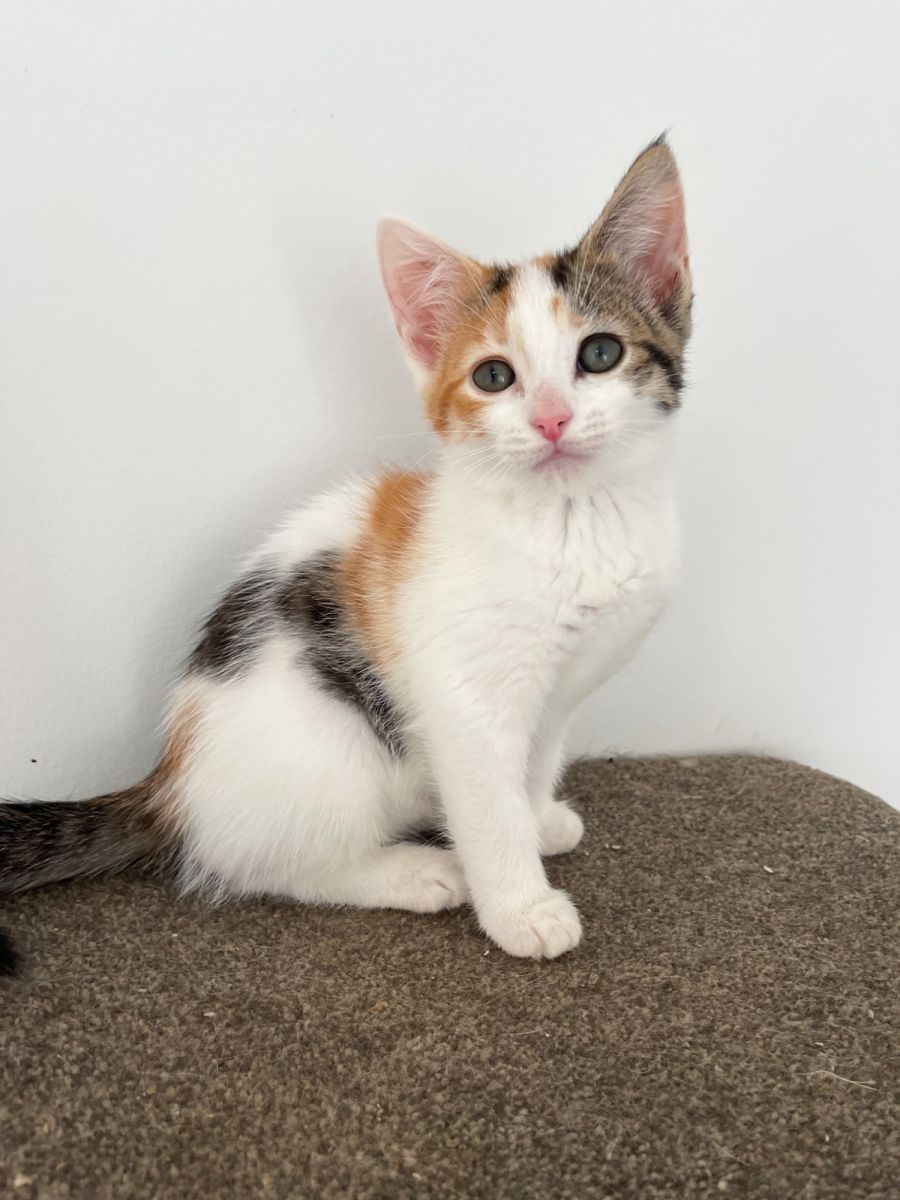 Skyler is an adorable calico kitten with a heart of gold! She arrived in foster care shy and nervous, but her foster mum has helped her blossom into a loving and playful companion. Skyler loves to play with her siblings, and she especially loves chasing the broom when her foster mum cleans their room. She's full of energy and enthusiasm for life!
