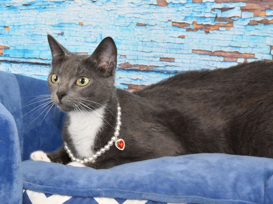 Dora's coat is mostly steel blue, however she has adorable white mittens. Beneath her blue steel coat lies a heart of gold—sweet-natured and affectionate. Though Dora has endured the challenges of abandonment and motherhood, she holds no grudges. Instead, she longs for the warmth and love of humans to call her own.