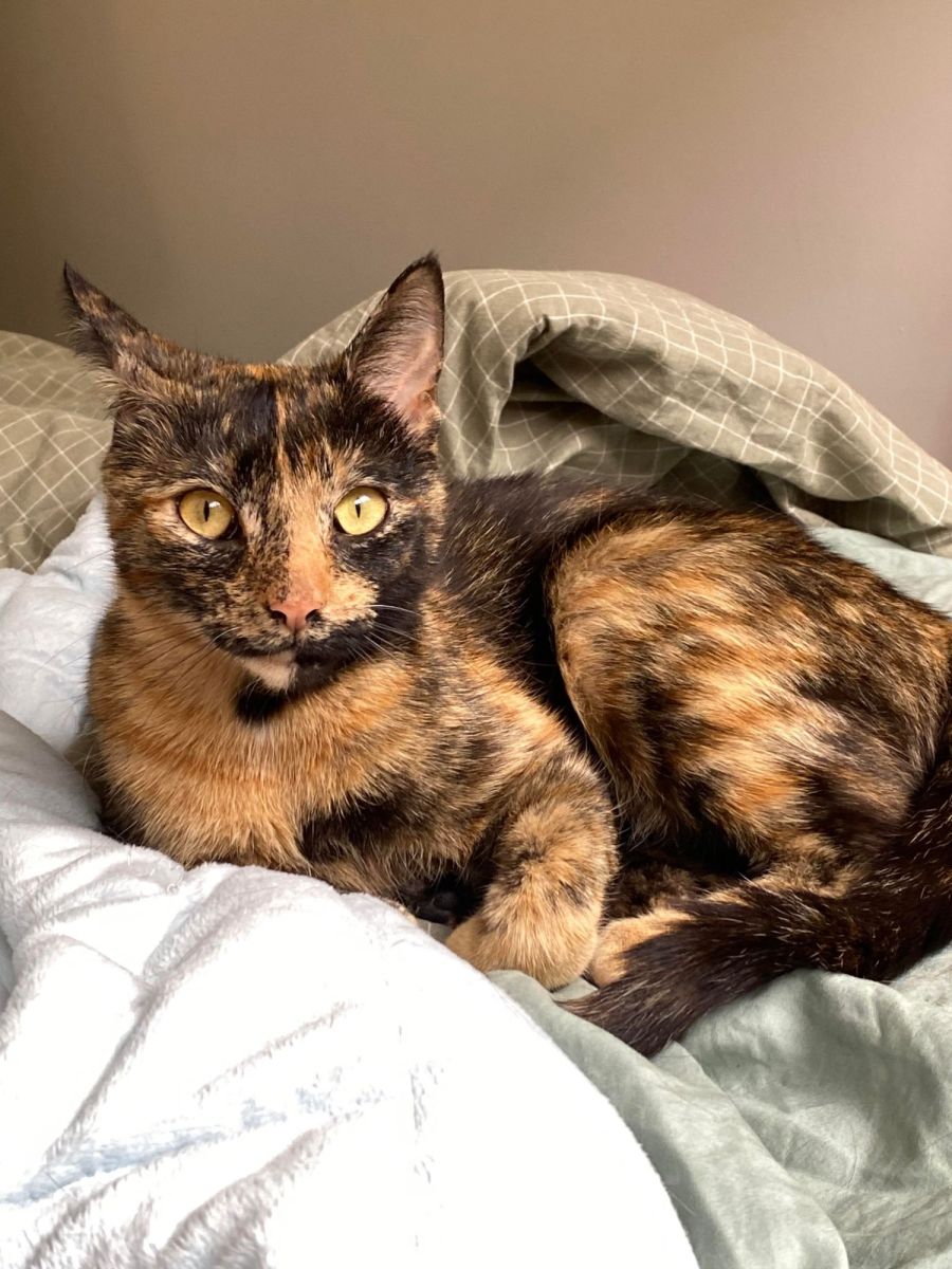 Now, let's talk looks. I've got these beautiful, almost symmetrical markings that'll make you question if I'm a work of art or just a cat. And, of course, I carry that famous tortitude—sleek, sassy, and ready to conquer the world.