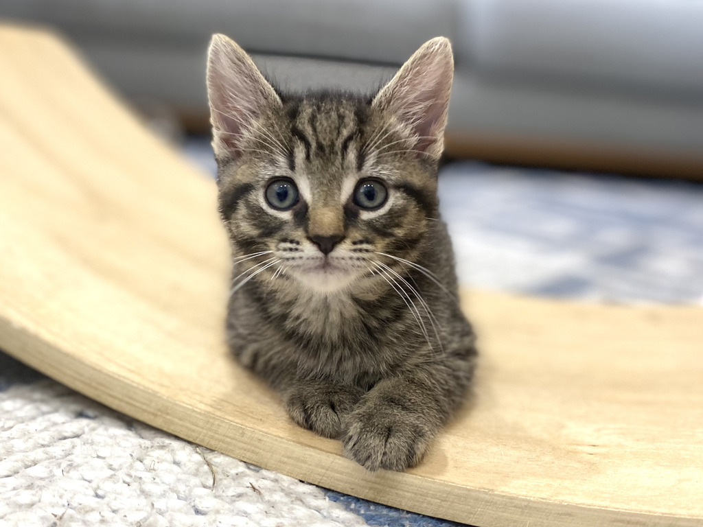 Joe is always excited for mealtimes, burying his head enthusiastically into his food bowl to refuel for the next round of play. His boundless kitten energy and incredible zest for life are perfectly balanced by his love of blissful head rubs that will turn him into purring putty in your hands. If you're lucky, you might even get to pat his adorable spotted kitten belly.