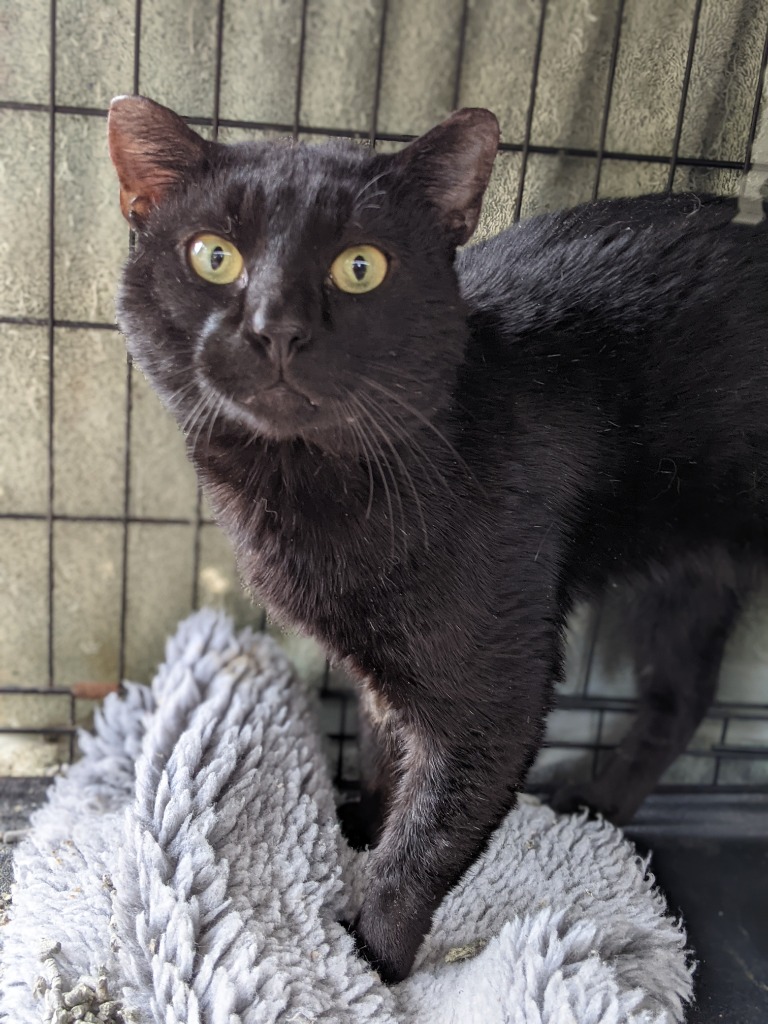 Dark Horse is roughly 5 years old. He's placid and sweet and enjoys gentle pats and ear scratches. He's got a calm air about him but will likely be quite unnerved when he first goes to a new home, as he's likely never been part of a real family before!