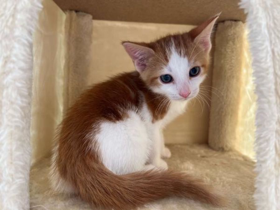 Morgan is a beautiful ginger-and-white kitten who is initially shy with strangers but warms up to people after enough cuddles and caresses. She is quiet but playful, loving to pay with kitten balls and feathery toys as well as climb cat trees. She is litter-trained, likes dry and wet kitten food, and sleeps deeply in the afternoons after lunch.