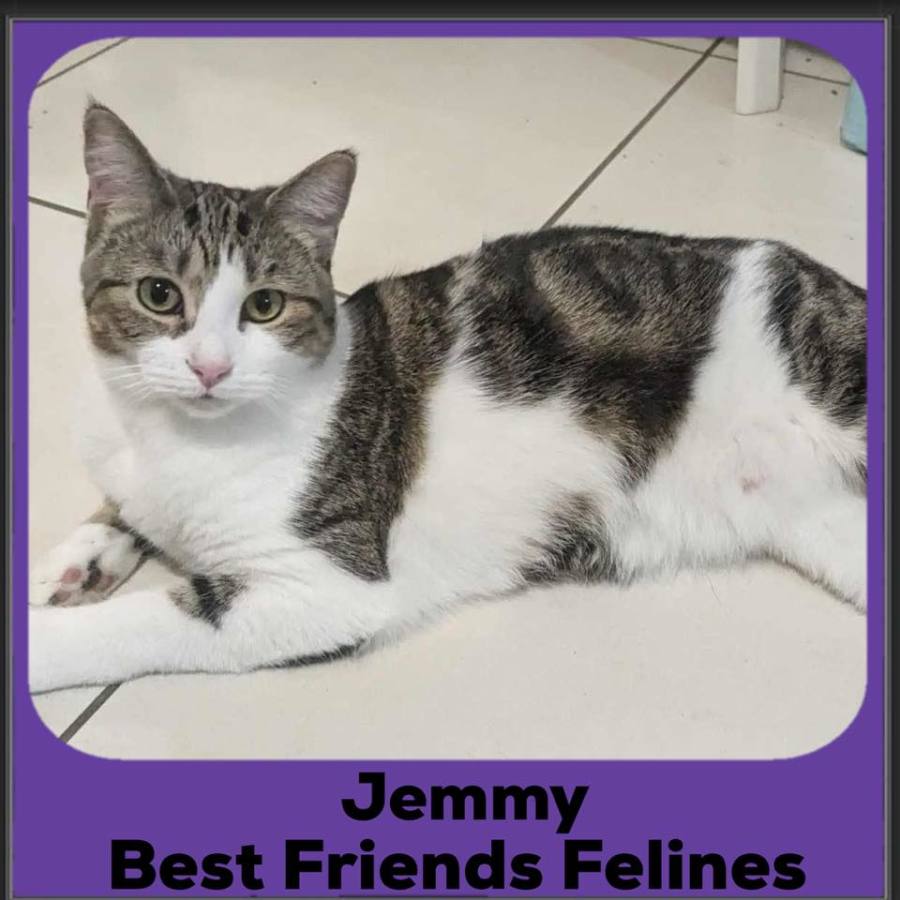 Jemmy, another adorable kitten born in care. Jemmy is just as cuddly and fun as Ruthie! She's always up for a snuggle and loves being the center of attention. But when it comes to playtime, Jemmy is all about chasing lasers and toys! It's hilarious to watch her dart around, trying to catch those elusive beams and pouncing on his favorite toys. And you won't believe it, but Jemmy is also quite the social butterfly. She loves hanging out with the big foster cats, learning from them, and even trying to keep up with their playful antics. Jemmy is such a bundle of joy and brings so much happiness to everyone around her