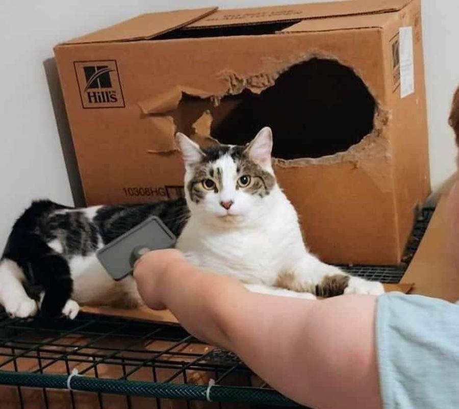 He’s great with other cats (once properly introduced) and dogs, but is a little skittish around loud noises and new people initially. May be suited to a home with older or calmer children.