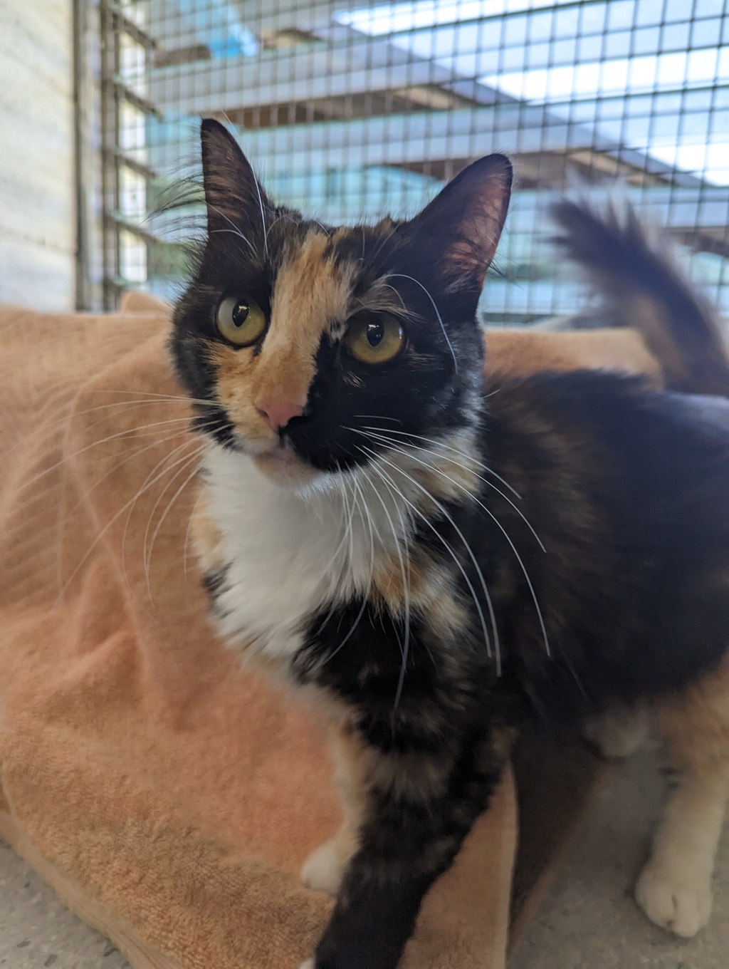 Meet Georgie, a delightful fluffy black tortoiseshell cat on a journey from reserved to confident. This enchanting feline, with a coat resembling a painter's masterpiece, is ready to find her forever home with a cat savvy adopter. Georgie's initially shy nature gradually transforms into a chatty, affectionate spirit as she gains confidence. Named after her charming personality, Georgie is seeking a patient and loving family who can appreciate her unique blend of independence and warmth. If you're ready for a companion who will enchant you with both her beauty and conversation, consider welcoming Georgie into your home-a furry friend ready to share a lifetime of love!