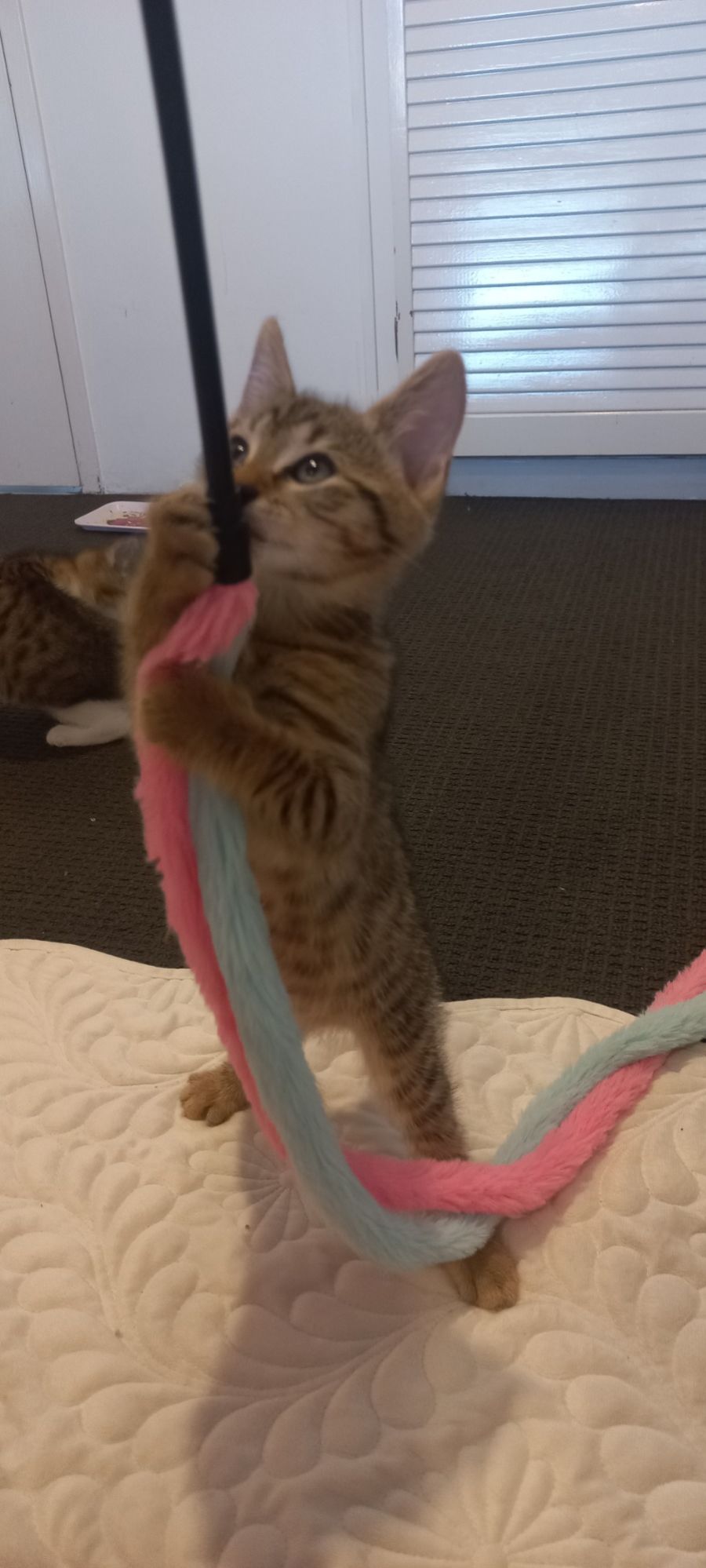 His favourite toy is butterfly on a stick, and he loves chasing after the butterfly.