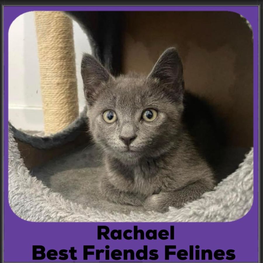 Rachael is a stunning grey girl, with an adorable little face, and energy to burn! Rachael loves playing with her kitten wands, and is a very good climber!. She is always the first one out to greet her foster mum in the morning and absolutely loves a cuddle. In the middle of play time she will come up and give you head butt to let you know it is cuddle time! She then lays in your arms and looks up at you with the most adorable face!